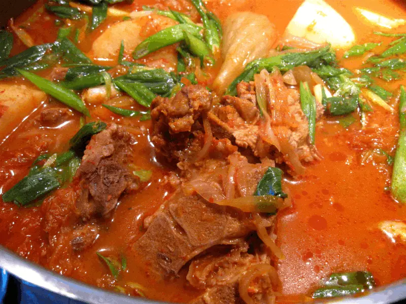 A spicy soup made from pork neckbones, and often includes potatoes, daengmyeon, dried radish greens, perilla leaves, green onions, and hot peppers, and some versions use sour kimchi.