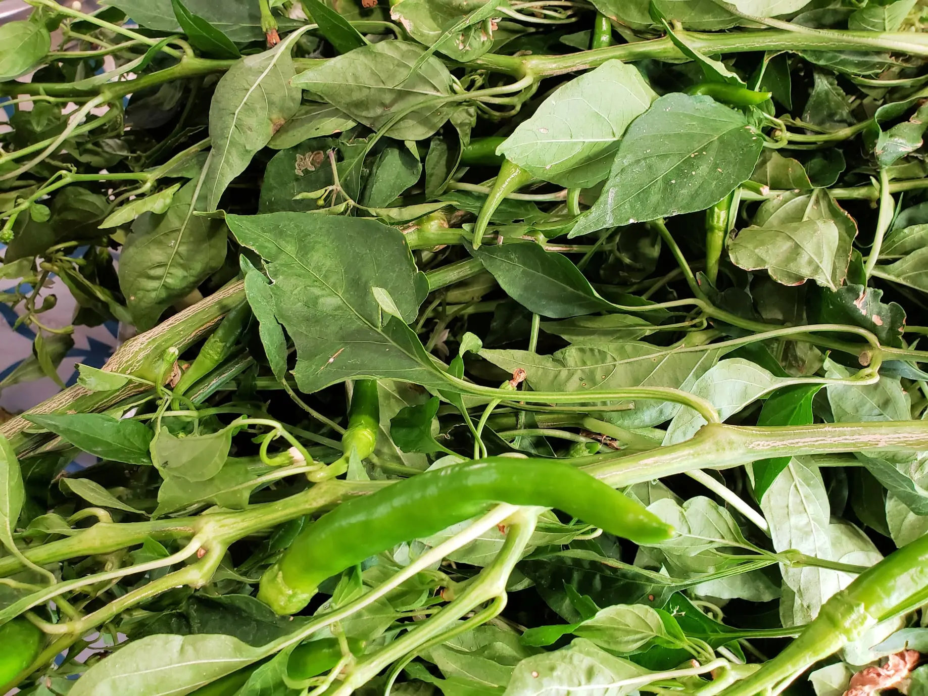 Chili pepper leaves have a mild flavor similar to a slightly sweet, slightly spicy spinach.